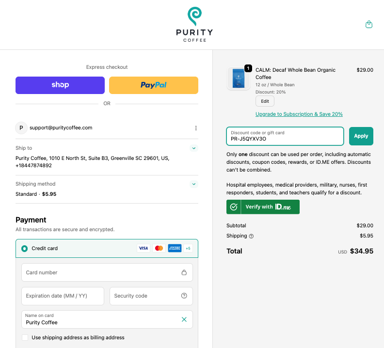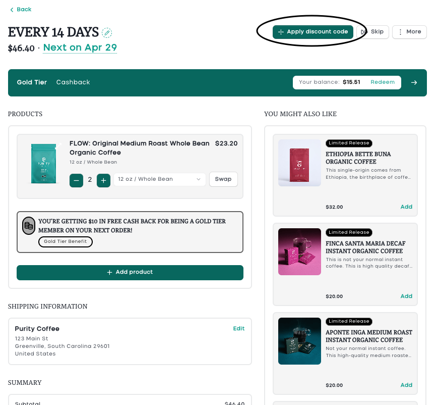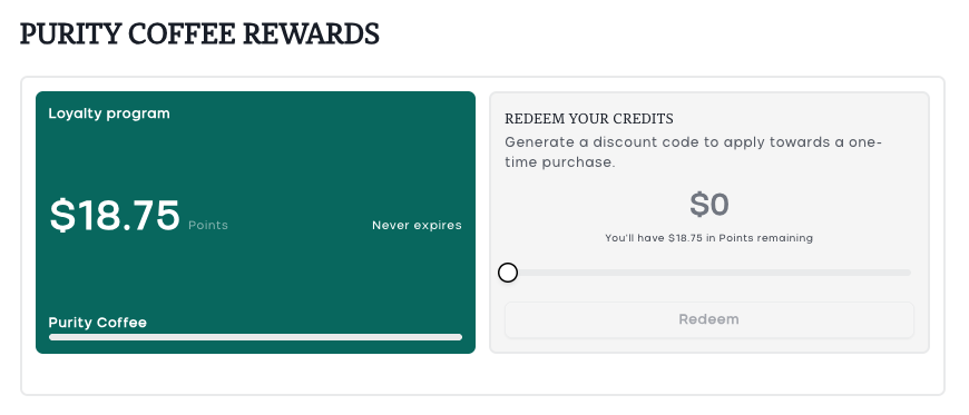 Your Purity Coffee Rewards points can be turned into a discount code that you apply at checkout, or to your next subscription renewal. Follow the steps below.
